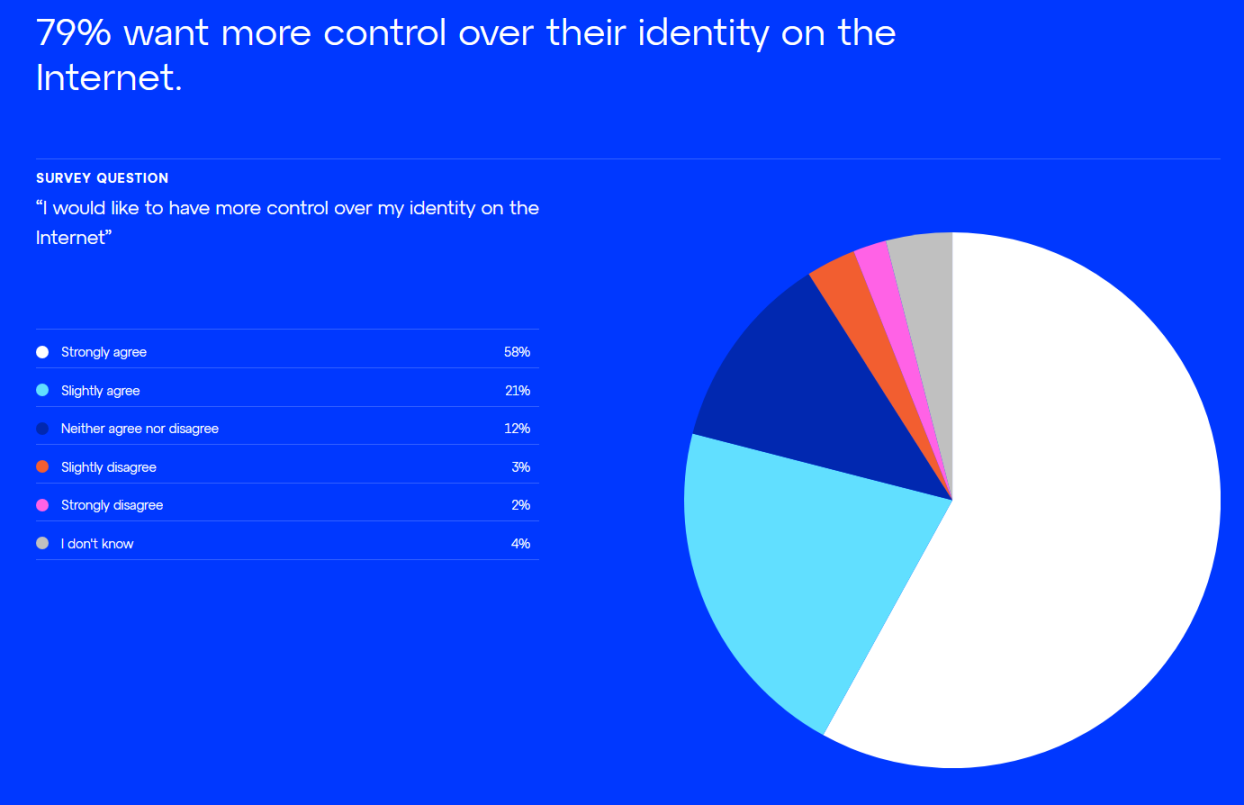 삶의 모든 측면에는 주택, 취업, 교육, 병력에 이르기까지 일종의 식별이 포함됩니다. 오늘날 웹에서의 신원은 귀하가 말하는 사람임을 증명해야 합니다. 당사의 디지털 신원은 귀하가 웹에서 사용하는 서비스 및 소셜 미디어 플랫폼에 의해 소유 및 제어되며, 일반적으로 모두 한 위치에 저장되지 않고 개인이 소유합니다. 대다수의 응답자는 인터넷에서 자신의 신원에 대해 더 많은 통제권을 원합니다.