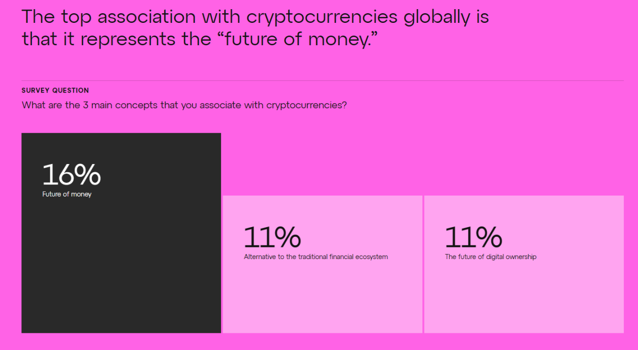 암호화폐와 관련된 개념은 무엇입니까? 전 세계적으로 암호화폐는 “화폐의 미래”이자 “전통적인 금융 생태계의 대안”으로 간주됩니다. 전 세계 응답자의 8%만이 암호화폐와 관련된 가장 큰 연관성으로 "범죄 및 돈세탁"을 선택했지만, 유럽 국가에서는 이를 투기(특히 프랑스와 독일) 또는 사기/피싱과 같은 부정적인 정보와 연관시킬 가능성이 더 높습니다.