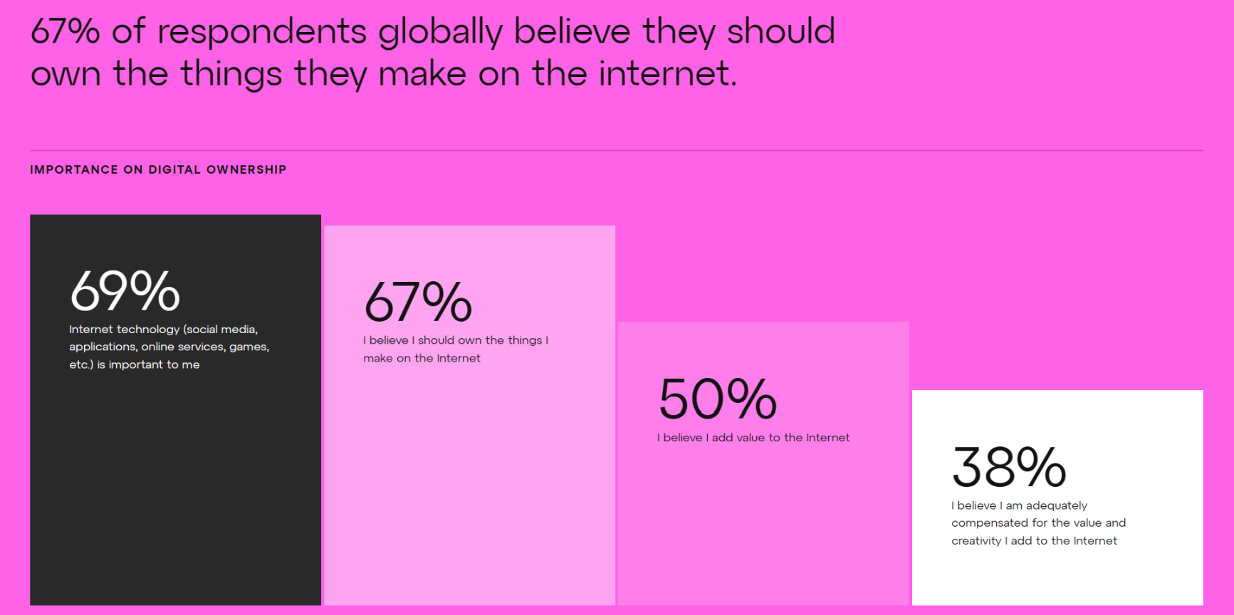 많은 응답자가 Web3에 대해 알지 못하지만 많은 응답자가 Web3의 기본 개념을 지원합니다. 50%는 자신이 인터넷에 가치를 더한다고 믿고 있으며, 67%는 인터넷에서 자신이 만든 것을 소유해야 한다고 주장합니다.