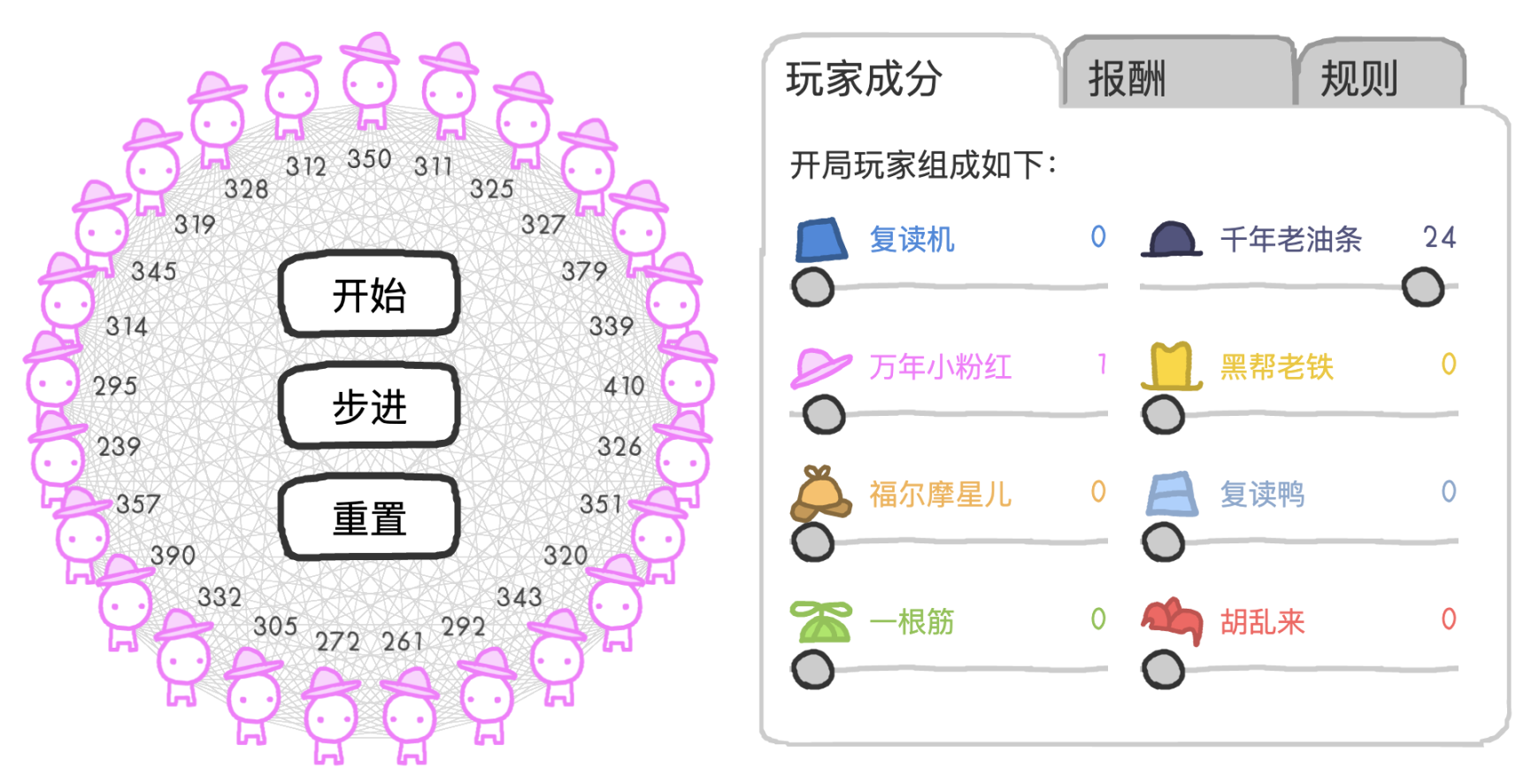 진화게임이론을 이론적, 수학적 관점에서 명료하게 설명하고 싶다면 이 글이 하려는 내용은 당연히 아니겠지만, 다행히 저자는 진화게임 시뮬레이션 게임의 매우 흥미로운 웹 버전을 발견했다. 『협동조합 진화』라는 책의 논리에 따라 쓰여졌습니다. 이 게임을 통해 진화론적 게임 이론의 핵심 내용을 빠르게 이해할 수 있으며, 컴퓨터 시뮬레이션을 사용하여 "다크 포레스트"의 암호화폐 시장을 더 좋게 만들기 위한 가능한 솔루션을 찾을 수 있습니다.