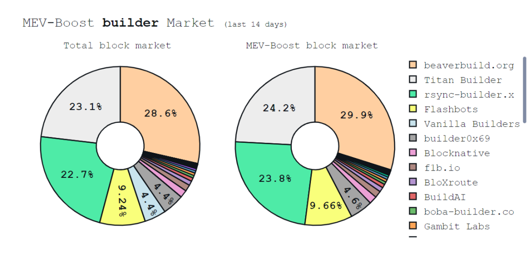 프로토콜 수준 PBS는 아직 이더리움 메인 네트워크에 포함되지 않았지만, Mev-Boost PBS의 현재 시장 분포를 이해하면 메인 네트워크의 향후 추세를 대략적으로 이해할 수 있습니다. mevboost.pic의 데이터 통계는 다음과 같습니다.