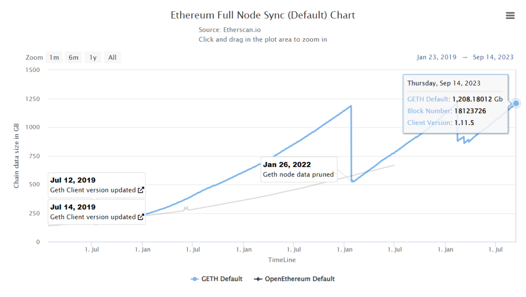 etherscan.io/data에 따르면 현재 빠른 동기화 전체 노드를 실행하려면 최소 1200Gb가 필요합니다(예: Geth 클라이언트). 이는 상태 정리가 수행된 후 이전 상태 데이터를 삭제하고 가장 최근 상태만 유지합니다. .전제. 아카이브 노드, 즉 풀노드가 각 블록의 상태를 포함한 모든 과거 상태를 유지하게 된다면 필요한 용량은 약 15,400Gb 정도가 되며 앞으로도 계속해서 증가할 것이라는 점이다. 커뮤니티에서는 종종 "상태 폭발"이라고 부릅니다.