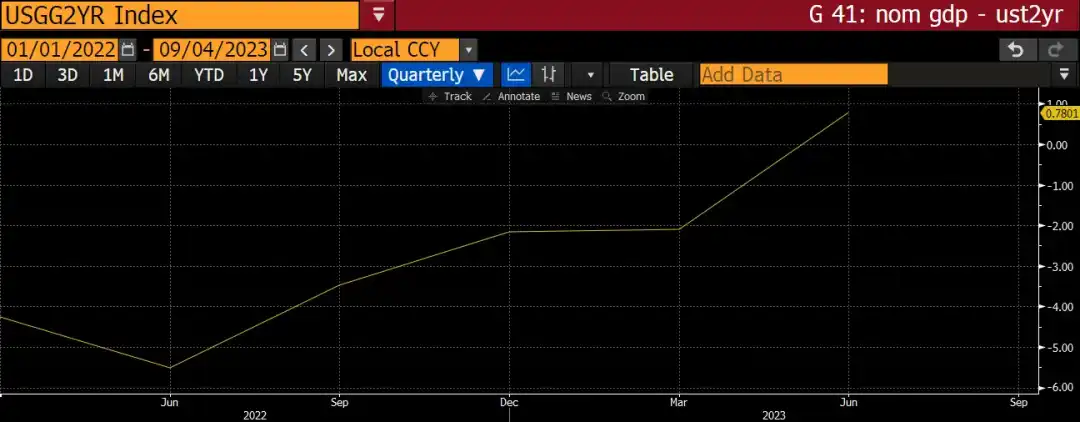 미국 2년 만기 국채 수익률에서 미국 명목 GDP 성장률을 뺀 값