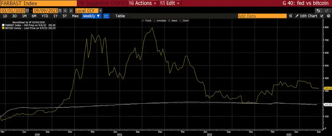 초기 지수 값이 100인 Fed 대차대조표(흰색) 및 비트코인(노란색)