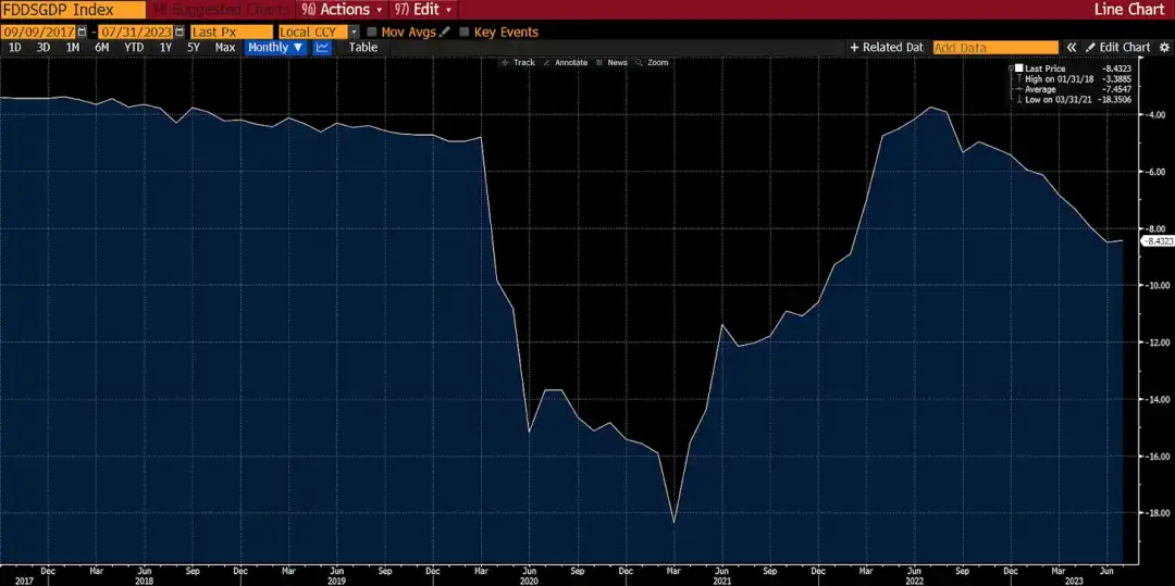 세입이 감소하는 동시에 정부 지출이 늘어나고 적자도 늘어나 적자가 늘어나는 상황이다. 정부 지출이 늘어날수록 적자는 커진다. 지출 증가 = 적자 증가, 지출 증가 = 명목 GDP 성장 증가, 논리적으로 적자 증가 = 명목 GDP 성장 증가.