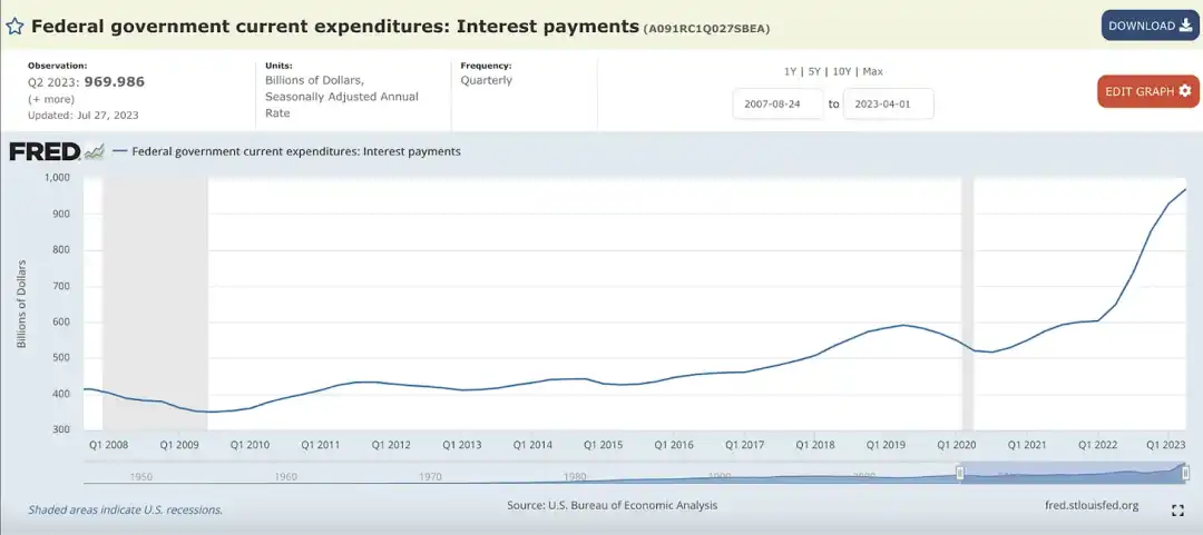 증가하는 적자는 더 많은 채권을 판매하여 자금을 조달해야 합니다. 연말까지 미국 재무부는 오래된 부채를 갚고 예산 적자를 메우기 위해 1조 8500억 달러의 추가 채권을 판매해야 합니다. 또한, 이러한 채권을 발행해야 하는 것 외에도 연준은 금리를 인상하고 있으며, 이로 인해 미국 재무부가 지불해야 하는 이자가 더욱 늘어납니다.