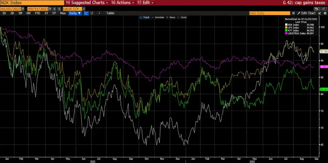 다음은 2022년 초부터 현재까지 S&P 500(노란색), 나스닥 100(흰색), 러셀 2000(녹색) 및 Bloomberg U.S. Aggregate Total Return Bond Index(마젠타)의 수익률을 100 기반 차트로 마감한 것입니다.