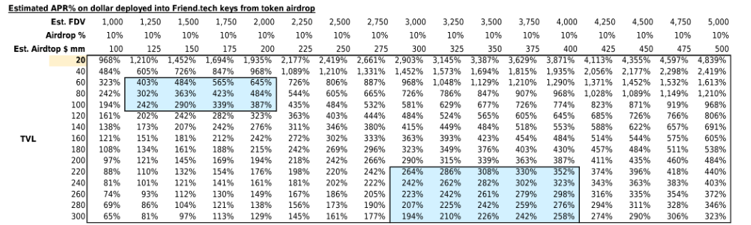 ● 아래 표와 같이 Friend.Tech 발행통화의 최종 FDV가 15억이라고 하면 10%를 에어드랍으로 사용하고, 25주 이내 평균 TVL은 80mm이며, 참가자들의 에어드랍 비율은 TVL에 참여하면 최종 연간 에어드랍 이자율은 약 ~360%입니다.