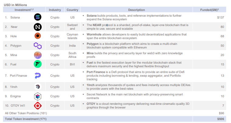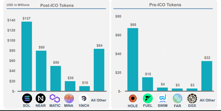 토큰 투자는 나머지 벤처캐피탈 투자의 13%를 차지했으며, 171건의 투자와 평균 투자 규모 300만 달러를 기록했다. 여기에는 주로 Solana의 1억 3,700만 달러, NEAR의 8,000만 달러, Hole의 6,800만 달러 등이 포함됩니다.