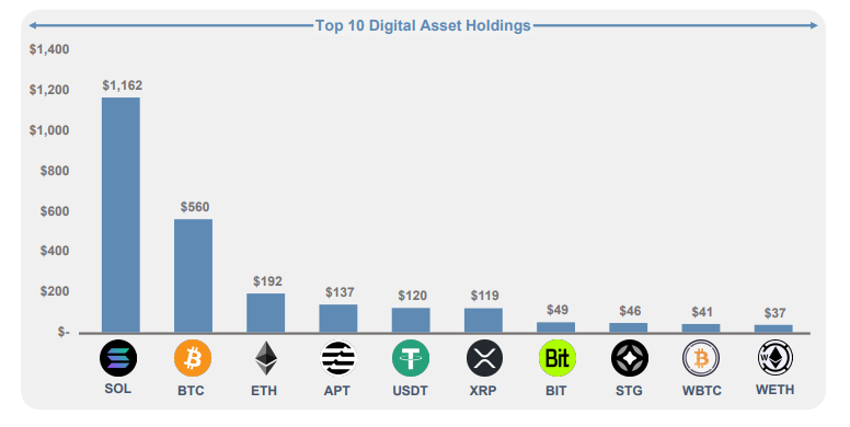 8월 31일 기준 FTX는 총 34억 달러의 암호화폐 자산을 보유하고 있으며 주요 암호화폐 자산은 US$11억 6천만 SOL, US$5억 6천만 BTC, US$1억 9천 2백만 ETH, US$1억 3천 7백만 APT, US$1억 2천만 USDT, US$1억 1천9백만입니다. XRP, 4,900만 달러 BIT, 4,600만 달러 STG, 4,100만 달러 WBTC 및 3,700만 달러 WETH. 이들 10대 주요 자산은 FTX가 집계하는 암호화폐 자산의 72%를 차지합니다.