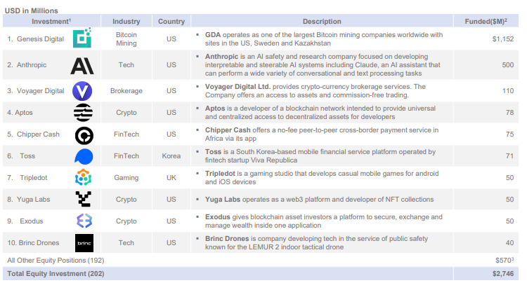 나머지 벤처캐피탈 투자 중 주식투자가 73%를 차지하며, 총 202건의 투자가 이루어졌습니다. 이 중 대표적인 것은 제네시스디지털(11억5200만달러), 앤트로픽(5억달러), 보이저디지털(1억1100만달러) 등이다.