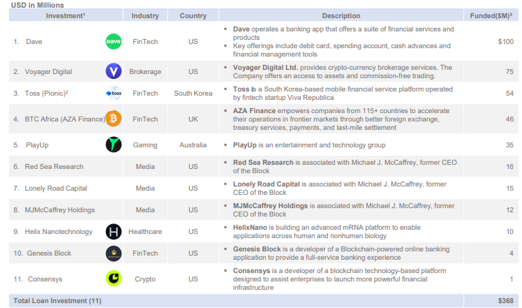 대출투자는 나머지 벤처캐피탈 투자의 10%를 차지했으며, 총 11건의 투자가 이루어졌으며 평균 투자규모는 3,300만 달러이다. 여기에는 주로 미화 1억 달러의 Dave와 미화 7,500만 달러의 Voyager Digital이 포함됩니다.