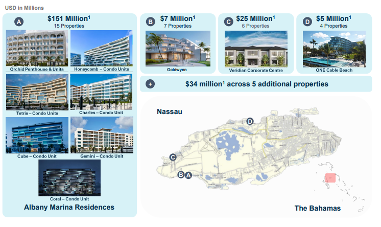 바하마에 있는 38개 부동산의 장부가치는 2억 2,200만 달러이고 감정가는 1억 9,900만 달러입니다.