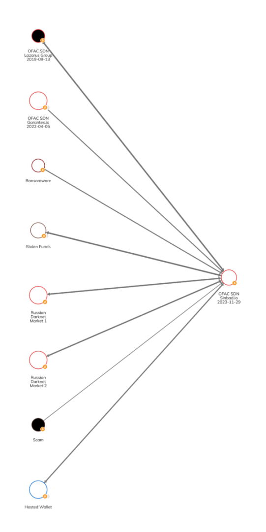 아래 이미지는 다크넷 시장인 Hydra Exchange Garantex와 함께 2022년 4월 제재를 받은 랜섬웨어 행위자, 다양한 다크넷 시장, 사기, 심지어 러시아까지 포함하여 Sinbad와 자금을 보내고 받는 불법 서비스 중 일부를 보여줍니다.