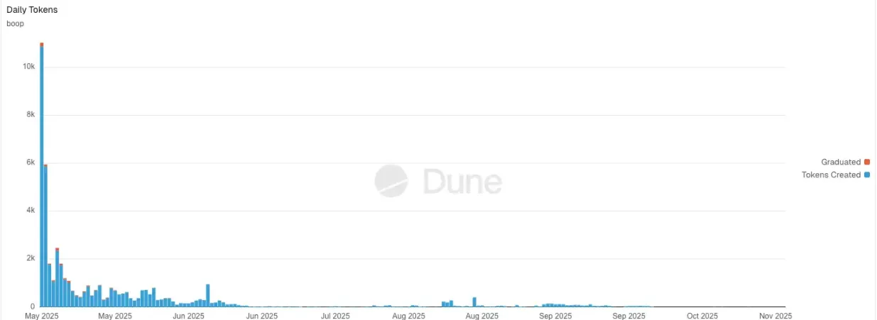 boop.fun이 5월 1일 출시되었을 당시, 플랫폼은 단 하루 만에 10,877개의 밈 토큰을 생성하며 pump.fun을 앞지르기도 했습니다. 그러나 그 이후로 성과는 계속 감소했습니다. Dune 데이터에 따르면, boop.fun은 "붕괴"되지는 않았지만, 지난 24시간 동안 밈 토큰을 단 하나만 생성했습니다. BOOP 토큰의 시가총액은 현재 800만 달러로 하락했습니다.