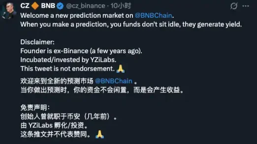12월 4일, 바이낸스 창립자 CZ는 YZi Labs가 인큐베이팅한 새로운 예측 플랫폼인 predict.fun이 BNB 체인에 곧 출시될 것이라고 발표했습니다. Polymarket이나 Kalshi와 같은 기존 예측 시장과 달리 predict.fun은 핵심적인 혁신을 이루었습니다. 사용자가 예측에 참여하는 데 사용한 자금은 더 이상 유휴 상태가 아니며, 예측 기간 동안 추가 수익을 창출할 수 있습니다.