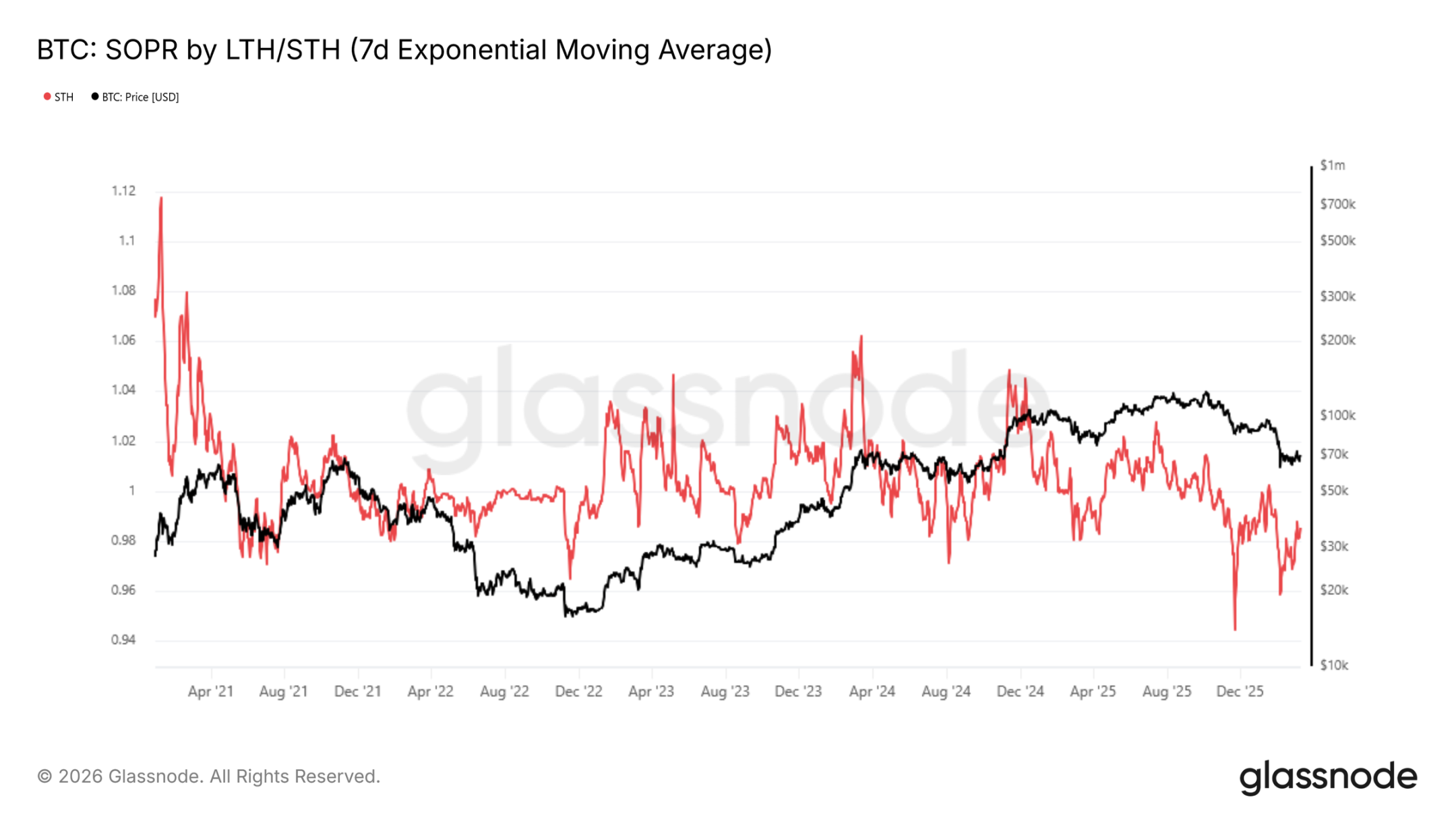 2025년 10월 이후 글래스노드의 시간별 온체인 데이터에 따르면 단기 보유자의 7일 지수 이동 평균이 1 미만인 0.985를 유지하고 있으며, 이는 최근 매수자들이 손실을 보고 매도하고 있음을 보여줍니다. 이는 약세장의 전형적인 특징입니다.