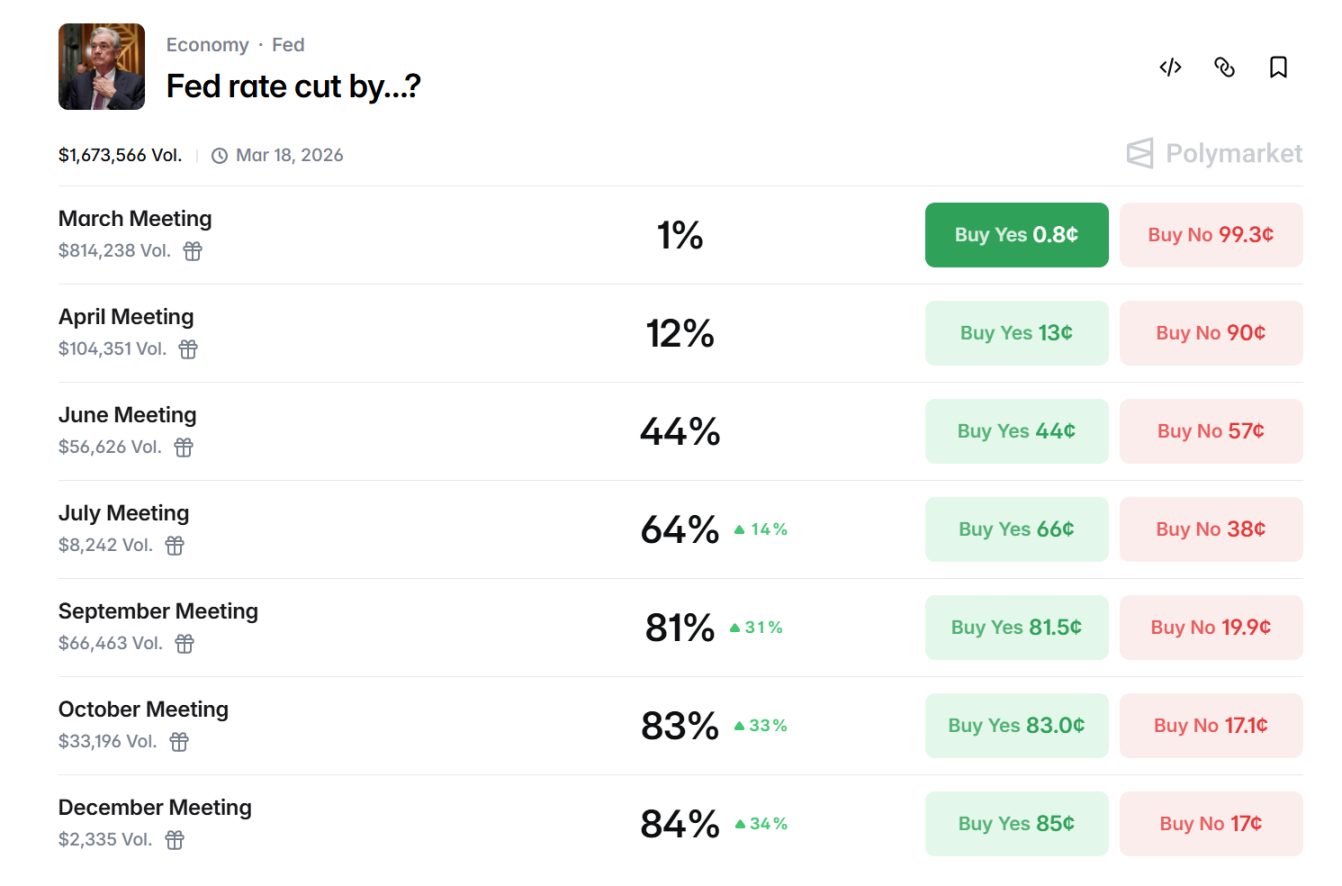 폴리마켓의 데이터에 따르면 현재 시장에서는 9월 금리 인하 확률을 81%, 6월 금리 인하 확률을 64%, 4월 금리 인하 확률을 12%로 예상하고 있습니다.