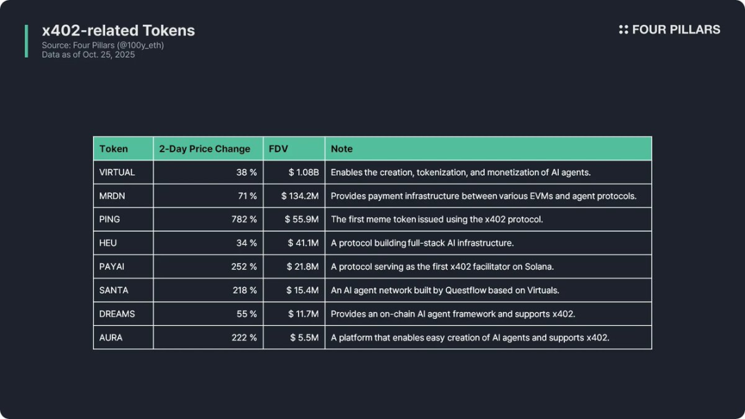 x402가 과대광고 단계에 접어들었다는 가장 직접적인 신호는 관련 토큰 가격 급등입니다. 예를 들어, "AI 에이전트" 개념의 부상과 함께 상승하는 경향이 있는 $VIRTUAL 토큰은 단 이틀 만에 40% 상승했습니다. 아래 차트에서 볼 수 있듯이 다른 관련 토큰들도 상당한 상승세를 보였습니다.