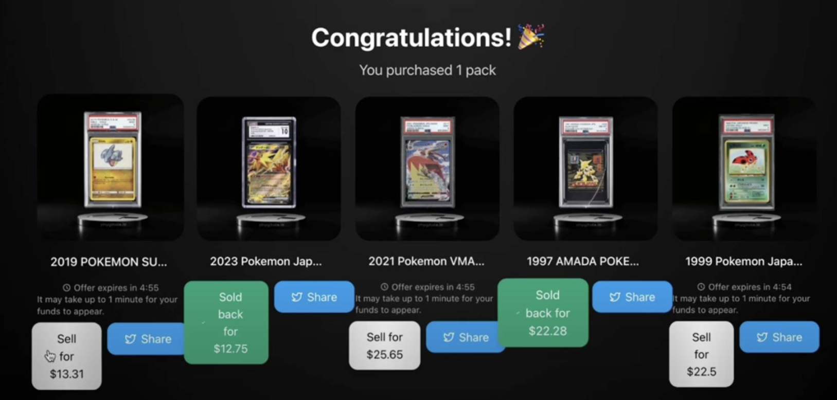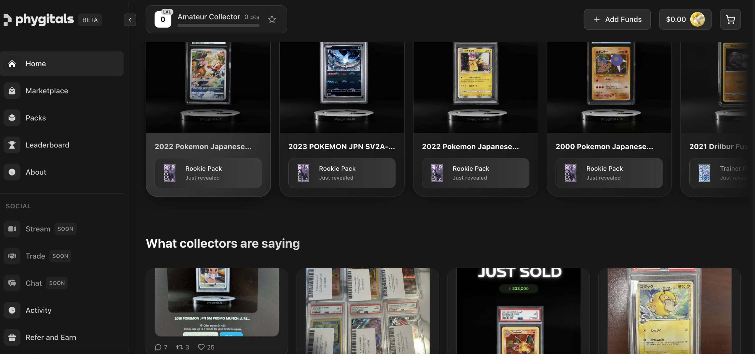 사용자는 Phygitals 플랫폼에서 1달러, 25달러, 50달러, 80달러, 250달러의 다양한 카드 팩 중에서 선택할 수 있습니다. 팩 가격이 높을수록 희귀 카드를 획득할 확률이 높아집니다. 최근 인기로 인해 80달러 팩은 현재 품절 상태입니다.