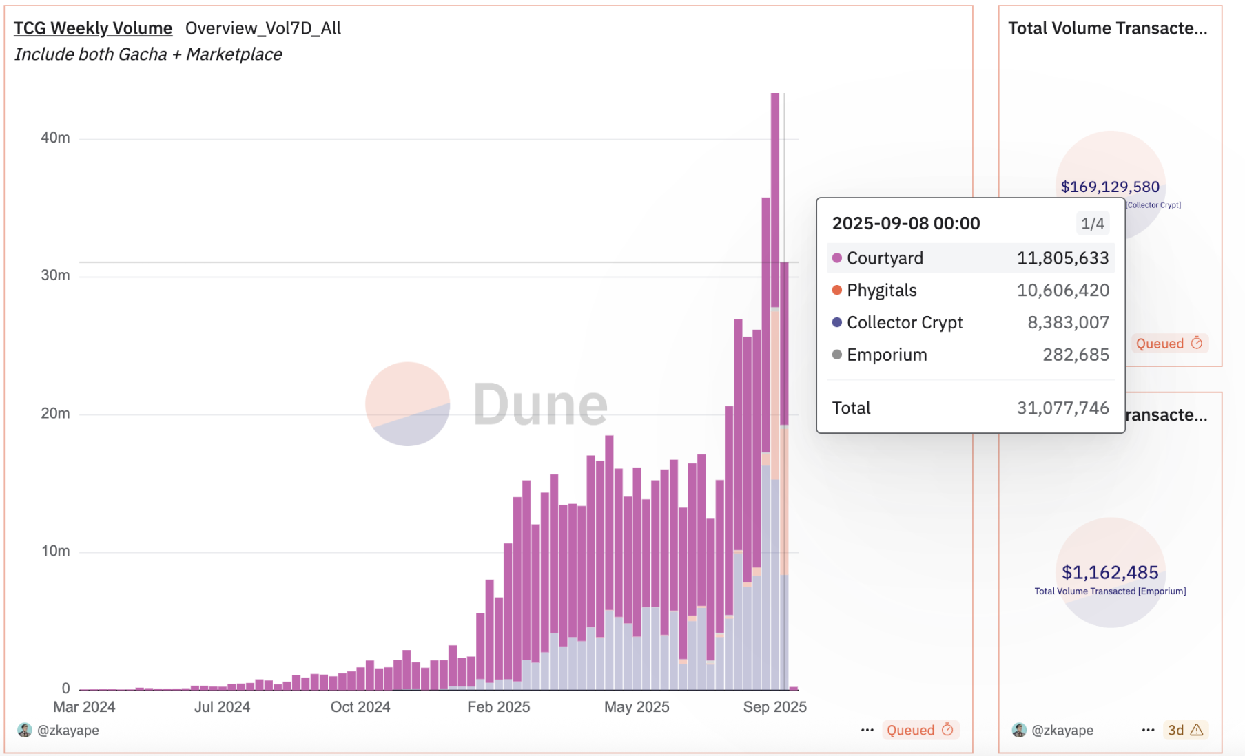 이러한 급격한 성장세는 포켓몬 카드 RWA라는 틈새시장을 주목하게 했고, 블라인드 박스 개봉과 포켓몬 IP 감성을 결합한 카드팩 메커니즘 또한 시장에 FOMO(공포심)를 유발했습니다. 듄(Dune) 데이터에 따르면, 지난주 TCG(수집형 카드 게임) 부문 상위 4개 플랫폼의 카드팩 판매 수익은 최대 3,100만 달러에 달했습니다.