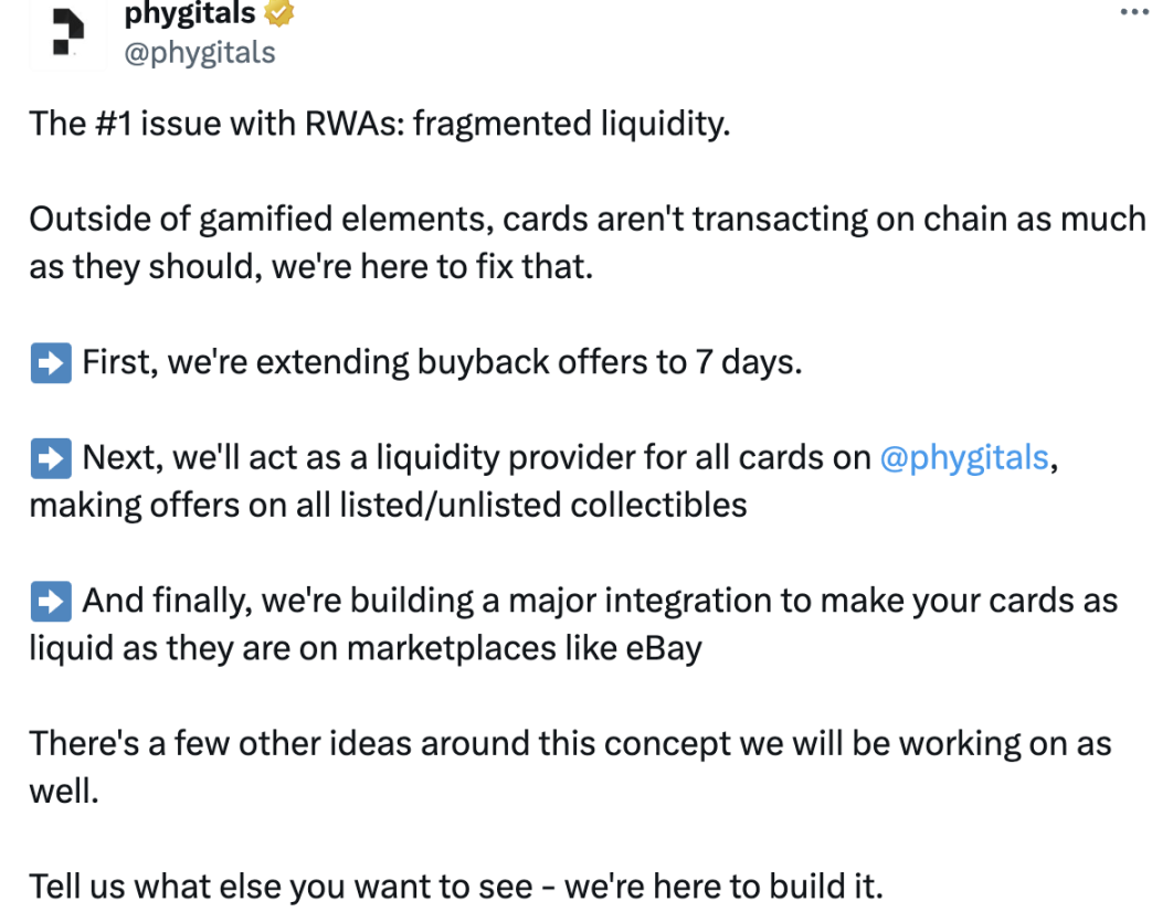 현재 Phygital은 사용자가 카드를 개봉한 후 30분 이내에 공정 시장 가격의 85%~90%에 플랫폼에 판매할 수 있도록 허용합니다. 앞으로 Phygitals는 재구매 기간을 7일로 연장할 계획입니다. 이러한 설계는 디지털 카드에 동종 토큰에 가까운 유동성을 제공합니다.