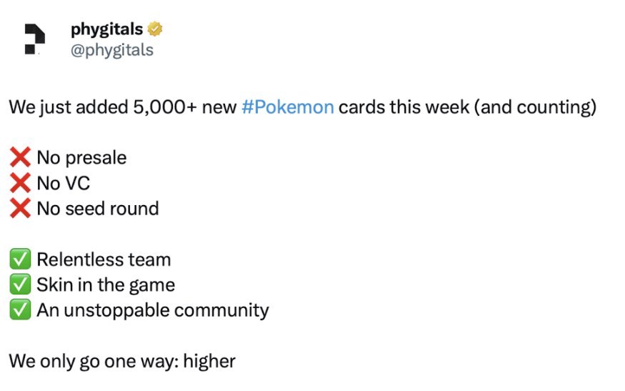 초기부터 VC 자금 조달을 모색하는 대부분의 암호화폐 프로젝트와 달리, Phygitals 팀은 외부 자금 조달을 일절 요구하지 않습니다. Phygitals 팀은 VC 자금이나 투자 유치가 필요 없다고 여러 차례 공개적으로 밝혀왔습니다.
