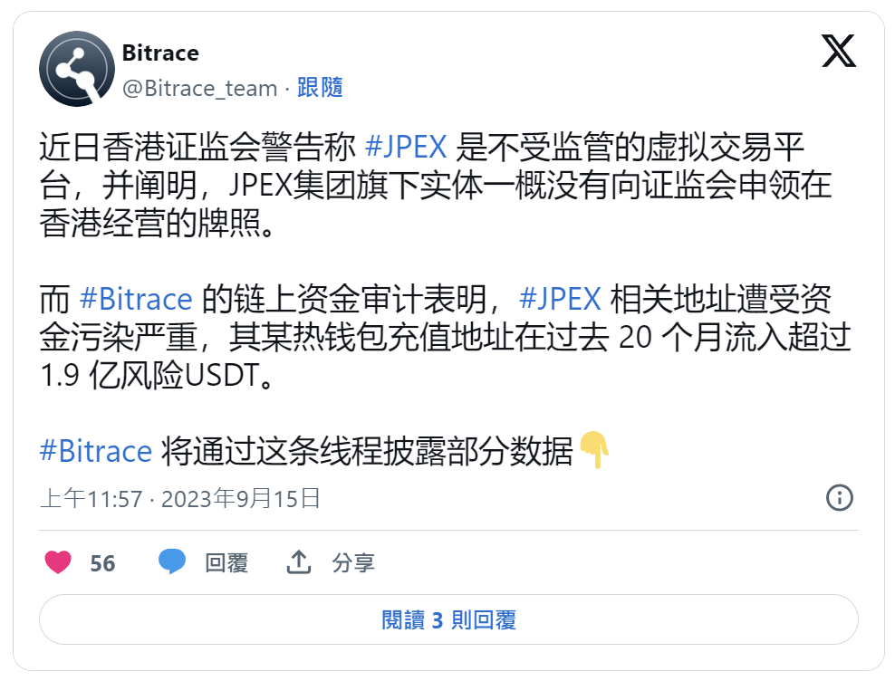 지난 9월 15일, 블록체인 데이터 분석업체 비트레이스는 트위터를 통해 JPEX와 관련된 트론 주소 뒤의 자금 흐름이 불투명하다며 핫월렛 충전 주소 중 하나에 지난 20개월 동안 1억9천만 USDT가 넘는 자금이 유입될 위험이 있었다고 밝혔다. 펀드 중 %는 리스크 펀드로 분류되었으며, 리스크 유형은 블랙 앤 그레이 자산, 온라인 도박, 자금세탁으로 확인되었습니다.