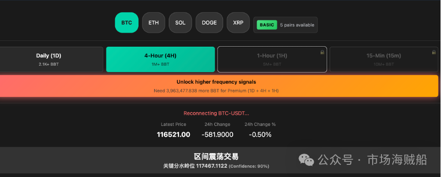 요약하자면, TradeFi는 차세대 온체인 JPMorgan Chase Private Bank(거래 신호), 온체인 Bridgewater Associates(거래 결과), 그리고 온체인 Berkshire Hathaway(거래 행위 자체)를 구축하고 있습니다. 이러한 설명이 다소 추상적으로 들릴 수 있지만, 실제 제품 사례인 BBT(Bull Bear Token)(https://123456btc.com/terminal)를 살펴보겠습니다.