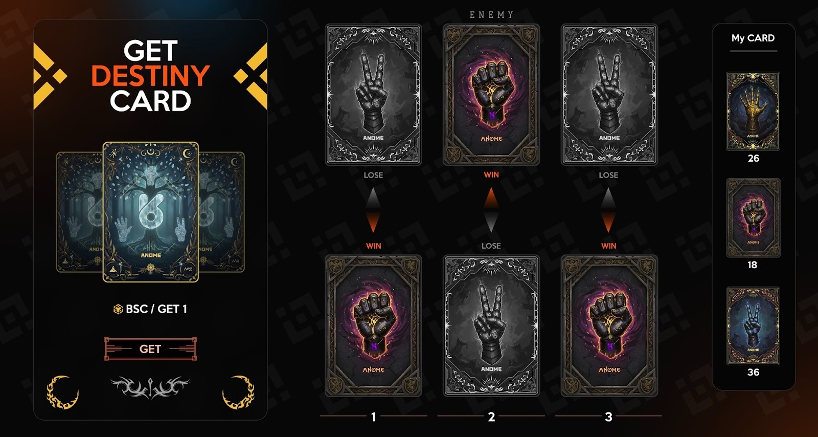 이 게임은 확률, 전략, 그리고 인간 본성에 대한 온체인 게임인 데스티니(Destiny)라고 불립니다. ANOME의 두 번째 핵심 모듈로, 3대3 PvP 9칸 그리드 시스템에 이은 게임입니다. 기존 블록체인 게임과 달리 데스티니는 복잡한 게임플레이나 스토리라인을 추구하지 않고, "데스티니"를 검증 가능한 메커니즘으로 세분화합니다. 플레이어는 $ANOME 토큰을 사용하여 세 가지 유형의 데스티니 카드를 생성하고, 플레이 순서를 설정하여 온체인에 배치합니다. 시스템은 비동기 플레이어들을 무작위로 매칭하고 자동으로 카드를 뒤집습니다. 승패는 즉시 결정되고 온체인에서 동기화됩니다. 각 매치가 끝나면 카드 한 장이 파괴됩니다. 승자는 남은 카드를 가져가 토큰으로 교환할 수 있으며, 패자는 시스템 에어드랍을 받습니다. 승패의 순간은 또한 가치가 다시 쓰여지는 순간입니다.